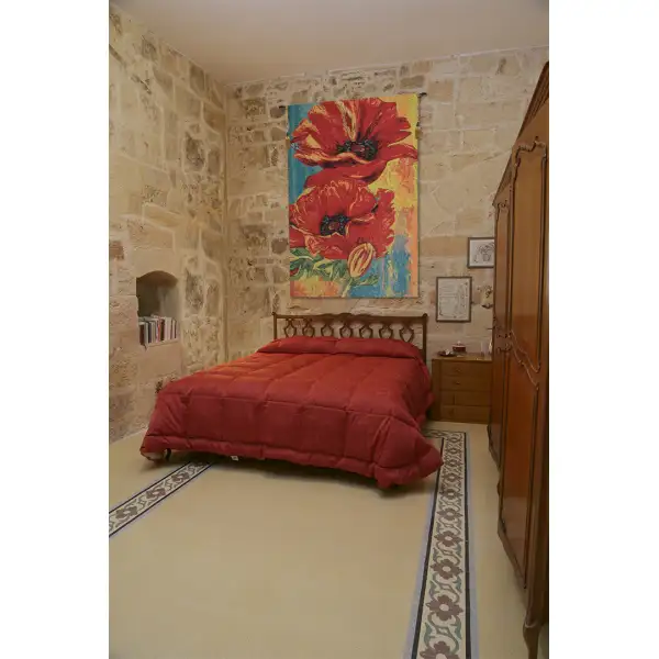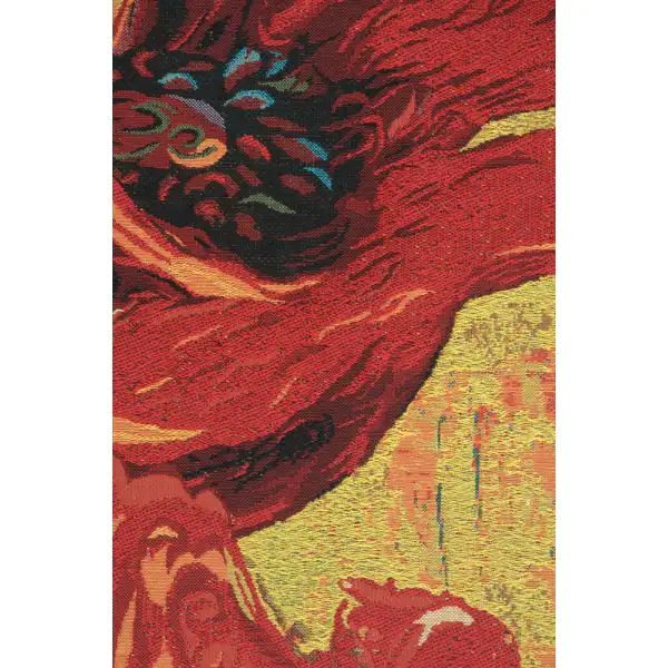 Bursting with a pair of bright red Poppy Blooms, our Two Poppies Tapestry will bring the beauty of botanicals and nature to any room. Based on the painting by Simon Bull, a living artist who grew up in Europe’s cultural centers, Southern China mountains, and jungles of South America. The British artist is popularly collected by the world’s royalty, celebrities and even presidents. Our tapestry rendition features the same intense coloring woven in cotton blend threads of red, orange, yellow, green and blue. Each poppy bloom is intricately presented for astounding beauty. Lined back and tunneled top for ease of installation. Imported from Belgium.