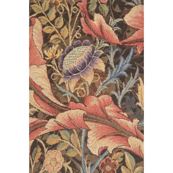 This jacquard wall art tapestry Acanthe, or Acanthus, is woven on a brown background. It is inspired from a William Morris embroidered panel done in 1898. This work portrays large acanthus leaves on a floral background.