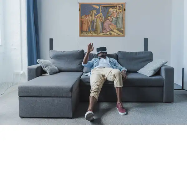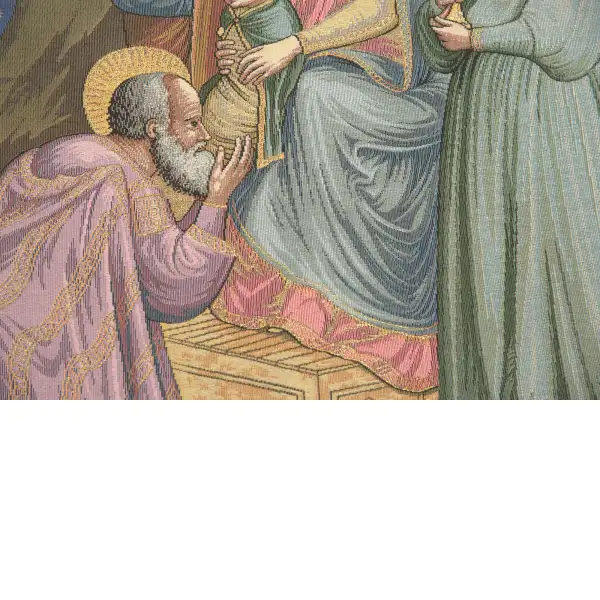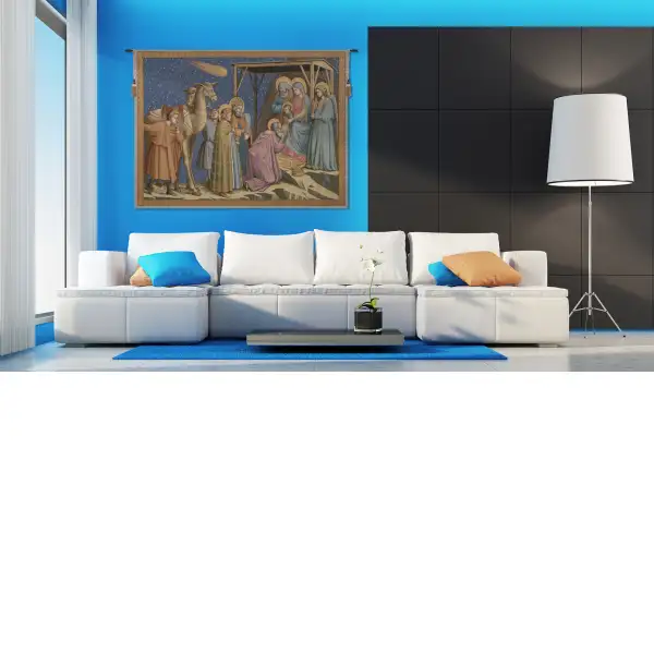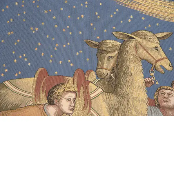 Adoration is an Italian jacquard wall tapestry. The art comes from he original artwork comes from Adoration of the Magi fresco completed in the 1310s by Italian painter Giotto di Bondone (1266 – 1337), known as Giotto.