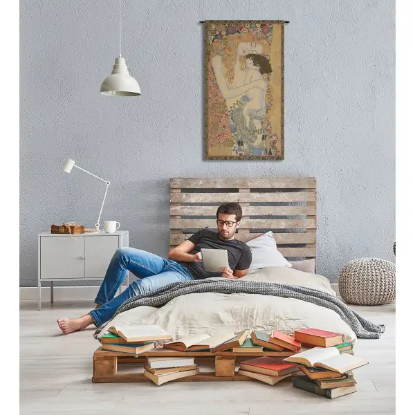 Ages of Women, Klimt is an Italian jacquard woven wall tapestry. The artwork is taken from The Three Ages of Women, painted by Gustav Klimt in 1905. He was a brilliant Austrian iconoclast who rose from childhood impoverishment to become an artist who enormously impacted the Viennese Secession and Art Nouveau movement. Known for elaborate, explicitly sensual paintings and murals, Klimt’s works also encompass themes of regeneration, love and death. Embedding his work with images symbolizing the freedom of art from traditional Western culture, Klimt’s eclectic range of influences included Egyptian, Classical Greek, Byzantine and Medieval styles. A forerunner of Modernism and the Art Deco movements, Klimt’s huge creative influence still resonates in modern art, decorations and jewelry.