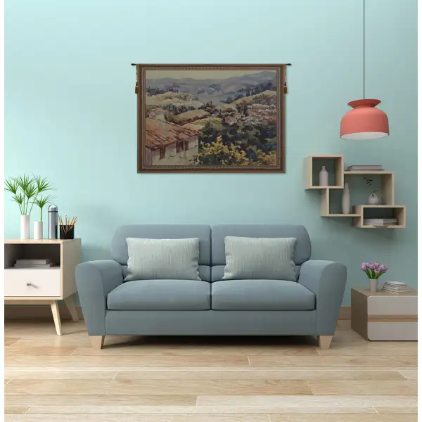 This charming tapestry sets a peaceful scene of the quiet Tuscan countryside. Featuring a white Tuscan style villa with a shingled roof in the foreground and a view looking down a rolling hillside complete with large trees and Tuscan style villas scattered all around.