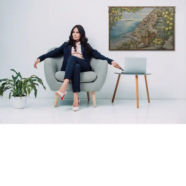 Transport yourself to the picturesque beauty of the Amalfi Coast with this exquisite Italian jacquard woven tapestry. This enchanting piece captures the essence of an Italian coastal scene, inviting you to immerse yourself in its charm. From a serene hillside balcony, the viewer gazes down upon sparkling waters, with adjacent hills dotted with charming houses and terraced gardens. A nearby lemon tree in full bloom and a bowl of freshly picked lemons on the railing bring vibrant colors and local flavor to the scene. Crafted with meticulous detail, this tapestry showcases Italian weaving traditions. Its intricate design and rich textures make it a captivating focal point in any room. Backed with lining and equipped with a convenient tunnel for easy hanging, this tapestry ensures effortless display and long-lasting beauty. Perfect for adding a touch of Mediterranean elegance to your home, it brings the warmth and charm of Italy to any space.