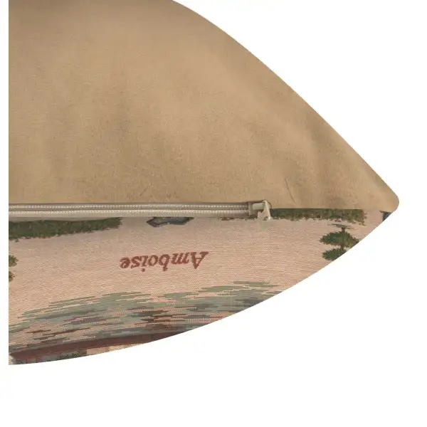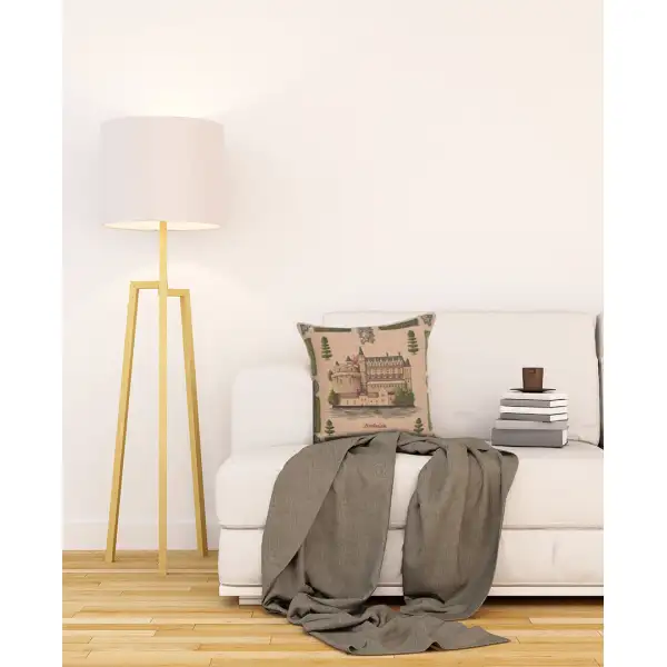 This European jacquard cushion cover represents a renowned château standing magnificently amidst a cream backdrop. Little trees planted around the figure symbolize the unity of home and nature.