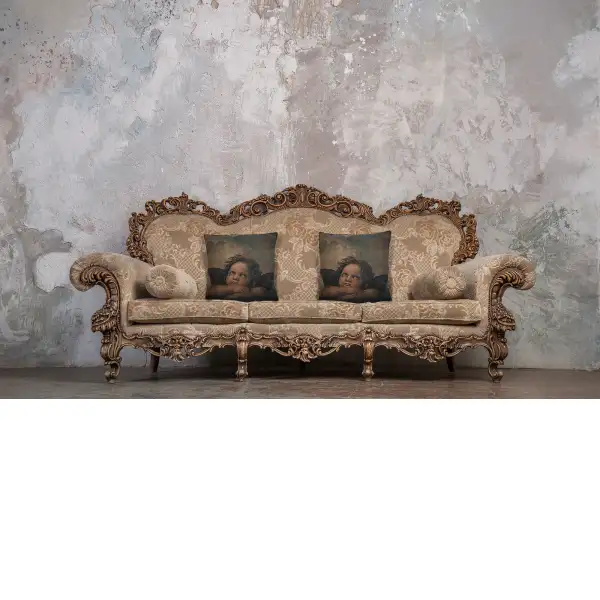 Angels by Raffael right is is a Belgian impressionist tapestry cushion cover piece inspired by the great master artist Raffael Sanzio. This cushion case cover is jacquard woven, the backed lining is of a plush velvet with an invisible zipper closure that allows easy placement and removal of cushion inserts.