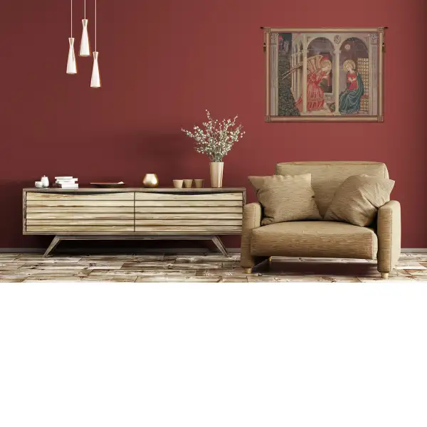 Annunciation with gold lurex Italian woven tapestry is based on the work of Fra Angelico (1395-1455). The famous fresco of a corridor in San Marco convent in Florence is the inspiration of this piece. Known as Beato Angelico or the 'Blessed One' in Italty, this famous Early Italian Renaissance painter created works which decorated the most coveted religious landmarks of Italy including the Vatican and San Marco of Florence, where he was a friar and was the lead artist who managed the decoration of the newly built monastery. Here in this scene, we see the Annunciation, where the angel Gabriel tells Mary that she is to conceive and that she is to name the child Jesus, meaning savior. We see the depiction of halos around the angel as well as Mary, symbolic of the holy nature of this scene. Fra Angelico is also known for a medicinal drink created by the Dominican monks, who named it after him. The hazelnut liqueur, sold in a trademark monk bottle, is known today as Frangelico.