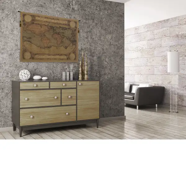 Antique Map Belgian chenille tapestry is also known as Typus orbis terrarum and features a gorgeous world map by Orterlius. In 1570, Abraham Ortelius published his groundbreaking “Theatrum Orbis Terrarum” (Theatre of the World), the first comprehensive modern atlas. Containing 53 full color maps, the atlas was an instant hit with scholars, navigators, explorers and the nobility. Of course, “Theatrum Orbis Terrarum” made Orterlius famous and he became renowned as one of the best map makers during his lifetime, which lasted from 1527 to 1598. Not bad for someone who had originally started out as an ordinary businessman. Thankfully, he met up with Flemish cartographer Gerardus Mercator and the rest is history. This wonderful reproduction of Ortelius’ world map, “Typus orbis terrarum”, a plate taken from his great work, is faithful to the original in every detail, including the colors. In “Typus orbis terrarum”, we see that most of the world’s land contours have been rendered quite accurately, even for its time.