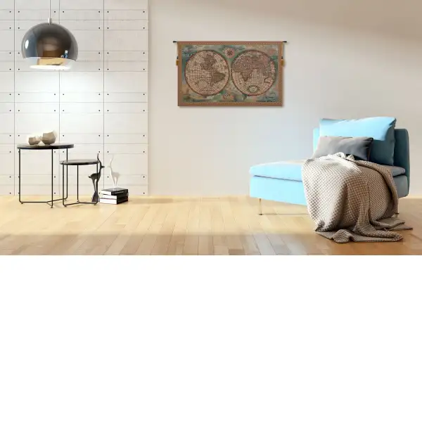 Reminiscent of the antique map displayed in German geographer and scholar Johann Hubner’s Conversations: Lexicon, de Religionen, 1777, our Antique Map I Tapestry captures all the mystery and beauty of the work of early cartographers. This intricate map features the intrigue of the sea with two large globes surrounded by elements of the water. Other smaller depictions in the four corners and upper and lower middle include a spouting whale, swimming school of dolphins, two ships with their voyages underway, and King Poseidon wielding his golden triton. The colors used to weave this tapestry are earthy in green, burgundy, gold, and blue. This antique map tapestry with border makes a studious addition to the office or study. Woven in Italy, the tapestry is made from cotton, viscose and polyester for softness and subtle sheen. Lined back and tunneled top for ease of installation.