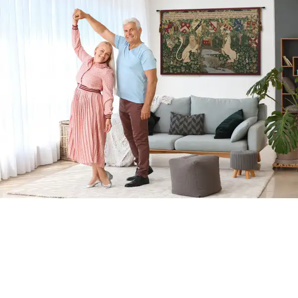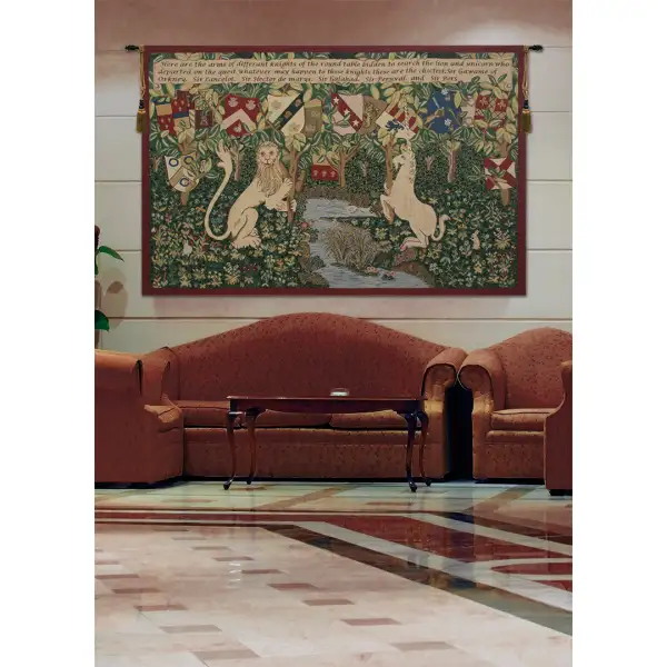 Arms of the Knights tapestry tells the tale of the 24 knights of the round table sent to search for the unicorn. In this tapestry the lion represents the knights as well as the shields, or "escutcheon" in the background.