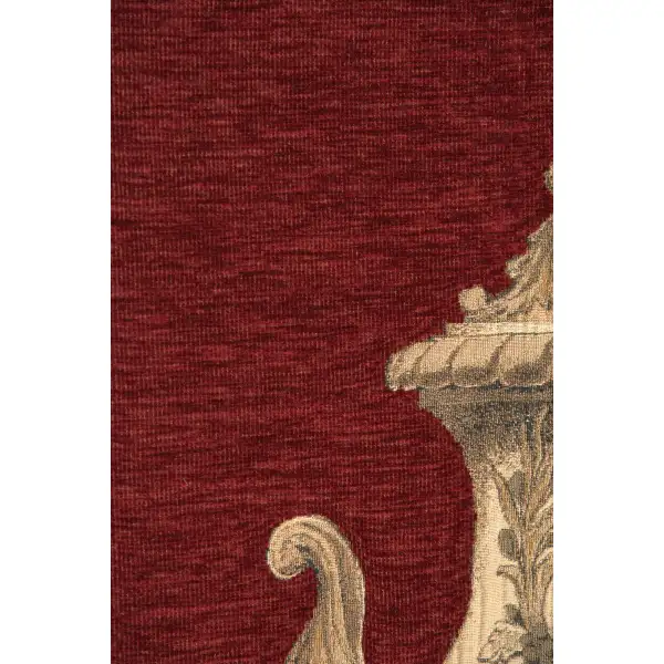 Athena Cinnabar woven tapestry wallhanging features an ornate rouge and gold border surrounding an elaborate gold urn on top of a vibrant rouge background.