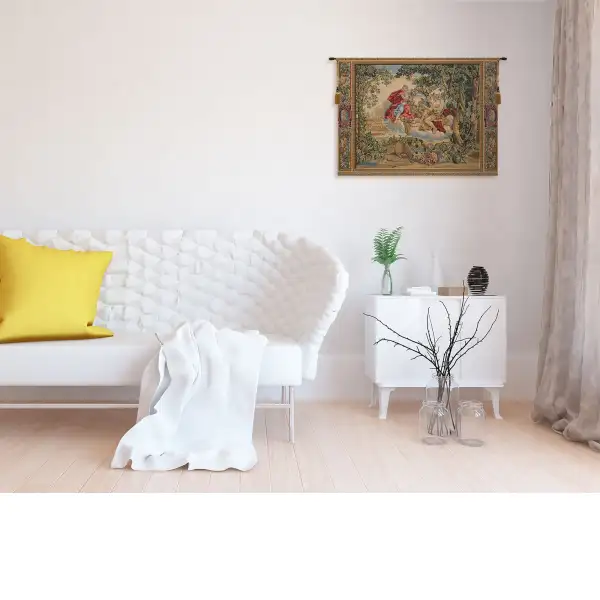 With its intricately woven motif and Baroque style design, the Bacco Wall Tapestry brings the beauty and elegance of the 17th century to the home. This finely woven European Romance tapestry is based on the original design by French painter Charles Le Brun. Declared by Louis XIV as “the greatest French artist of all time, Brun was a the most influential artist of the French King’s reign. This jacquard wall tapestry is but one of four that Brun produced depicting the four seasons. Rich colors of red, gold, green and blue are woven in a scene with angels holding a wreath of in which a hunting scene is depicted. A basket on the ground overflows with a bounty of fruits and melons. Place this historical Italian woven tapestry in your living room or entry for a bit of intrigue and color. Made of a cotton, viscose and polyester blend. Imported.