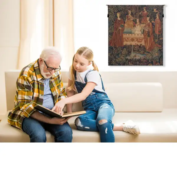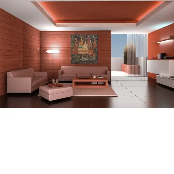 This Belgian wall tapestry, Bain, or the Bath, is a reproduction from the time of Louis XII (1462-1515). The original is exhibited at the Cluny Museum, Paris. This tapestry represents a noble lady bathing and surrounded by her ladies-in-waiting and servants. A fine accent to your home décor.