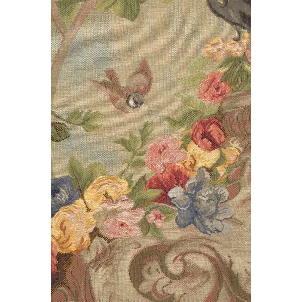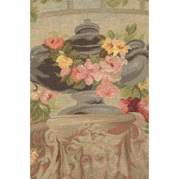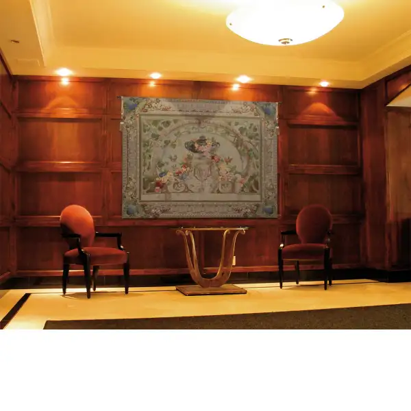 The original, Beauvais, was woven at the Manufacture de Beauvais in the middle of the 19th century for the dining room of the Elysee palace. (Now residence of the French President) This French impressionist jacquard woven tapestry wall hanging represents a bowl surrounded by a splendid blossoming floral crown framed with green foliage of climbing ivy. This lovely piece is the perfect addition to your home decor motif.