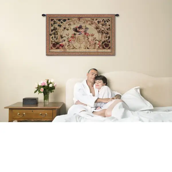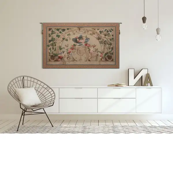 The original, Beauvais Feuilles Vertes, or Green Leaves, was woven at the Manufacture de Beauvais in the middle of the 19th century for the dining room of the Elysee palace. (Now residence of the French President) This French impressionist jacquard woven tapestry wall hanging represents a bowl surrounded by a splendid blossoming floral crown framed with green foliage of climbing ivy. This lovely piece is the perfect addition to your home decor motif.