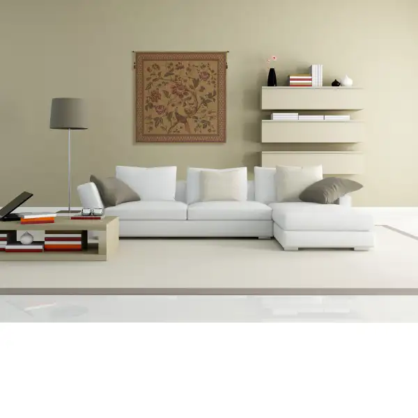 Birds of Paradise With Border Belgian chenille tapestry features flowers and an exotic bird surrounded by a beautifully ornate border. This decorative piece shows the beauty of classic styled Belgian floral decorative works where flowers and birds are used to create a fantasy scene to celebrate the beauty of nature.