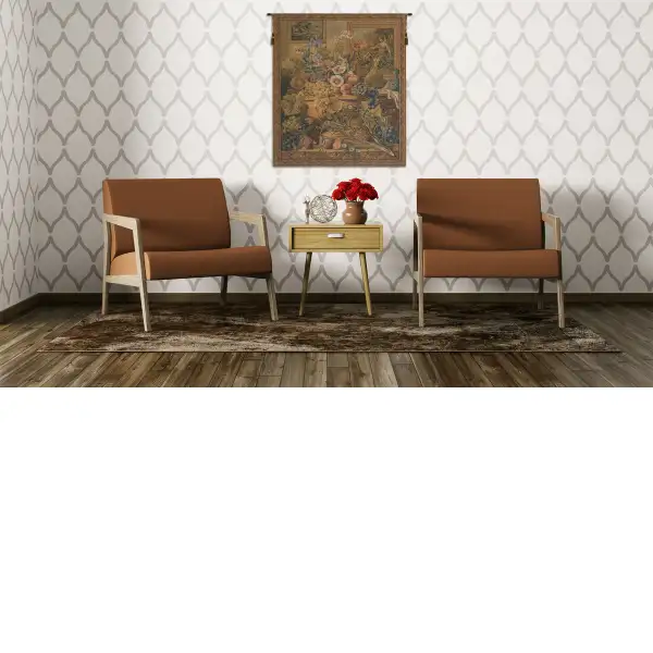 Bouquet and Frames is a Belgian jacquard wall tapestry. This classic and formal still life brings a touch of elegance to your home. A great urn of fruit and flowers takes center stage, while the background features rich paintings and and furnishings to bring a sense of wealth and opulence to the composition.