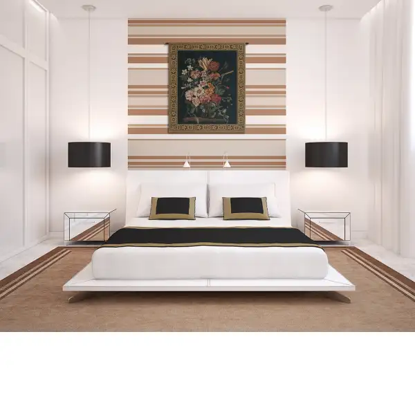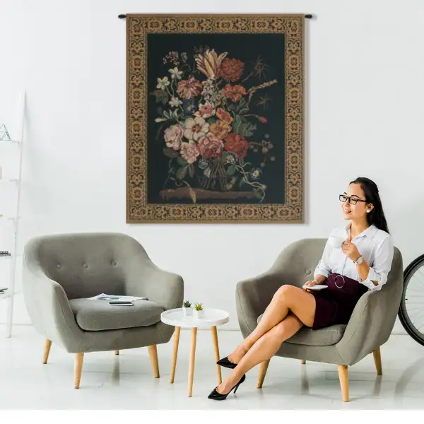 Bouquet de Verendael Belgian tapestry is a 17th Century motionless life piece featuring a vase full of flowers inspired by the painter Nicolaes Van Verendael set with a black background.