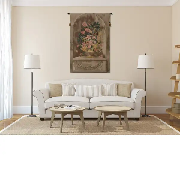 Bouquet Niche is a French impressionist jacquard woven tapestry wall hanging inspired by an early 18th century English tapestry known as the Arabesque. The array of colour dances along the spectrum granting the imagery a sense of fresh spring renewal as the yellow blossoms rest amidst the bright and soft pink blooms.