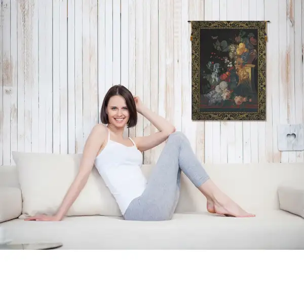 Bouquet on a Column is Belgian made jacquard woven wall tapestry This still life flower and fruit composition is a representation of the oil painting by Cornelis Van Spaendonck (1756-1840). This classic and formal decor presents an opulent display of fruit upon an ornate pedestal, a bouquet rests before it upon a dark background; edged with an ornate golden border.