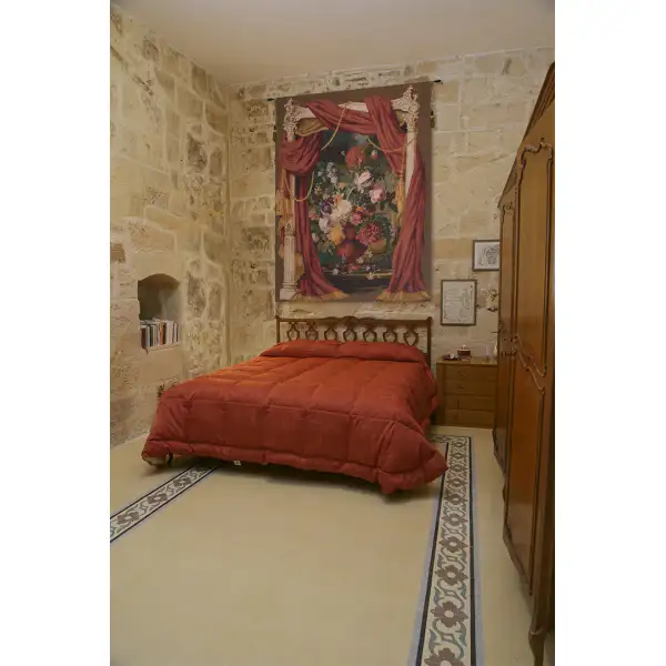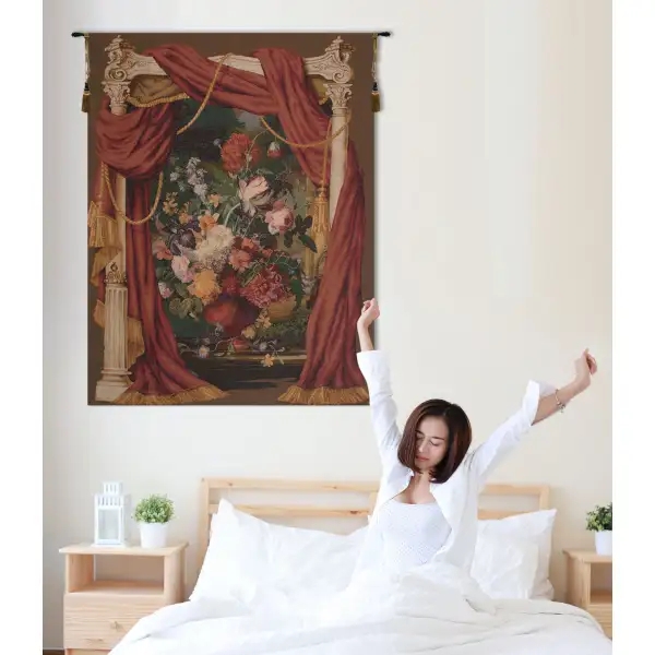 Bouquet Theatral French impressionist jacquard woven tapestry wall hanging inspired by an 18th century Dutch masterpieces, with an embellishment of elegant framing of columns and draperies added for an innovated aesthetic. A marvelous addition to your home décor motif.