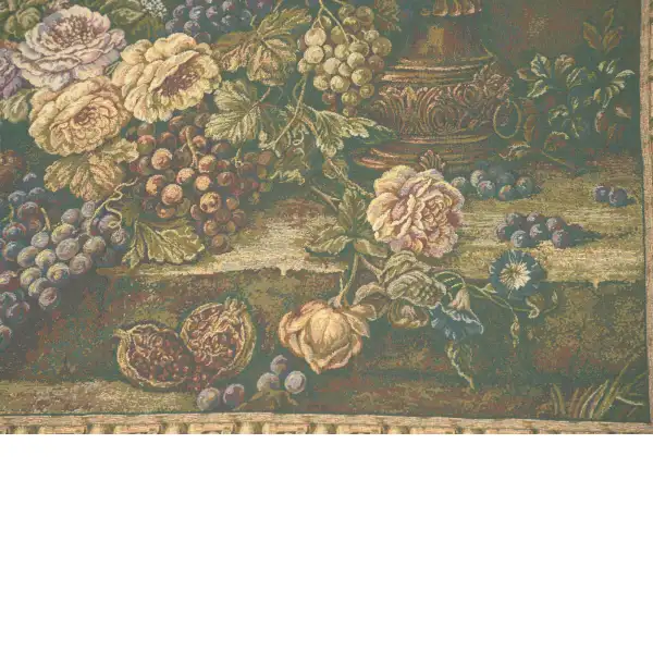 Bouquet with Grapes Green is an Italian jacquard wall tapestry. It portrays an abundance of roses and grapes artfully strewn upon a dais.