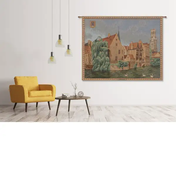 Brugges Riverside is a French impressionist jacquard woven tapestry wall hanging representing a landscaped view of the magnificent Belgian city of Brugge, marrying the architectural world to the shore of the water creates an impressive view of the riverside in Medieval Brugges. Brugges has been a great power in cultural arts and is still a predominant location associated with tapestry weaving. A marvelous addition to your home décor motif.