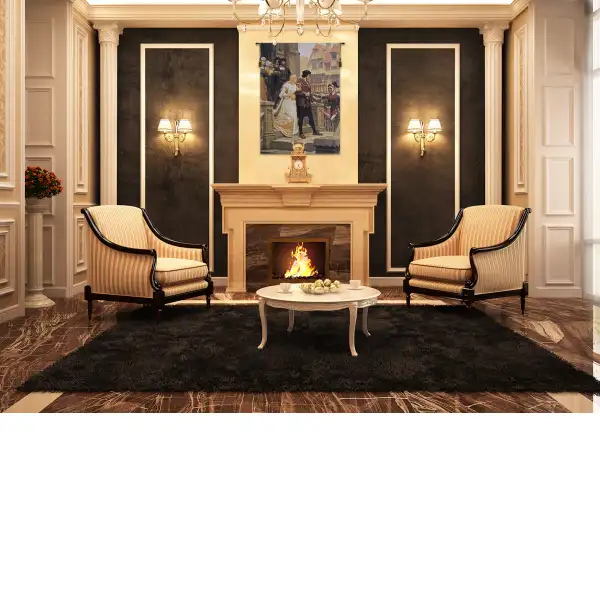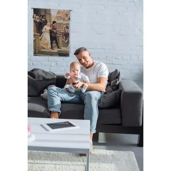 God Speed is a Belgian jacquard wall tapestry depicting the 1900 painting by Edmund Blair Leighton (1853-1922). His works show a great beauty and a romanticized view of life in the Middle Ages. In this scene we see the prince and his bride emerging from the church. The sudden change is seen in the faces of all the paintings subjects as the groom interacts with an approaching knight in armor. This tapestry, like Leighton's other works, displays a realist approach coupled with a feeling of romanticism.