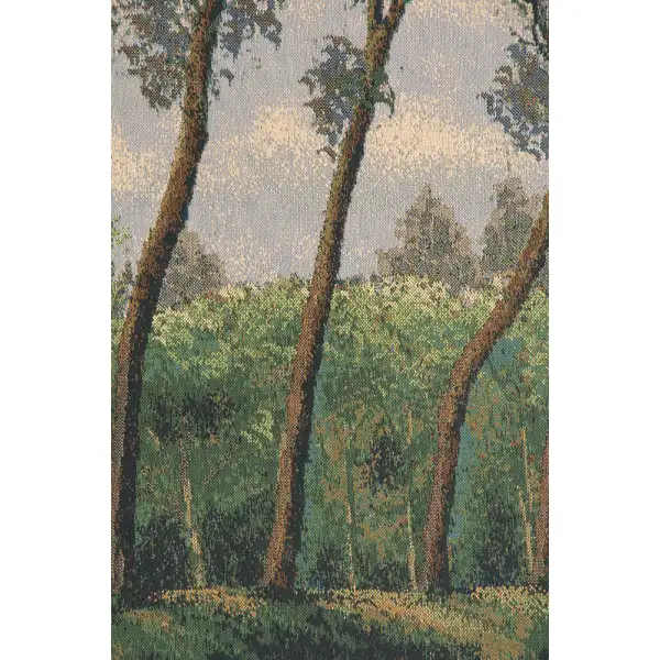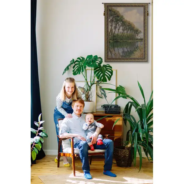 Canal in Flanders Mill is a jacquard woven wall art tapestry made in Belgium. It features a canal scene near Bruges reminiscent of a Pissarro painting. To create this tapestry, the artists have taken their inspiration from old documents. The row of bending trees is typical of a Flemish landscape. The imagery of this tapestry brings out the beauty of any home.