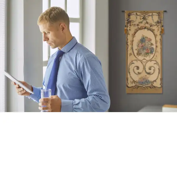 Caroline Gold is a fine art Belgian made jacquard wall hanging tapestry. The inspiration for this portière came from decorated wooden panels attributed to Rembrandt. The original tapestry work was woven in St. Petersburg, Russia in the mid 19th century. It now hangs in the State Historical Museum, Moscow. This piece is impressively stunning and really ties the room together.