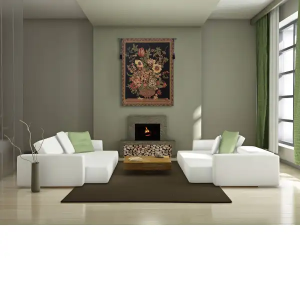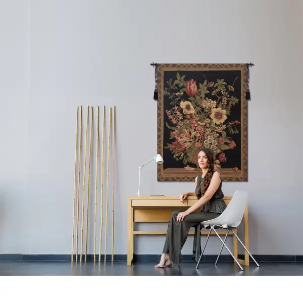 Inspired by the grand floral artworks of Jan Brueghel de Velours, a 14th century Brussels born Flemish artist, our Century Floral Black Wall Tapestry makes quite the evocative centerpiece on any wall. Known for his intensely detailed and beautifully colored paintings of flowers and still lifes, the one inspiring our tapestry is no different. It features a wildly blooming floral centerpiece with a plethora of pretty floral types set in a vase against a deep black background. The tapestry is woven by expert weavers in Belgium from cotton/viscose/polyester blend for a soft hand and textural sheen. Imported from France. Backed with lining and tunnel for easy hanging.