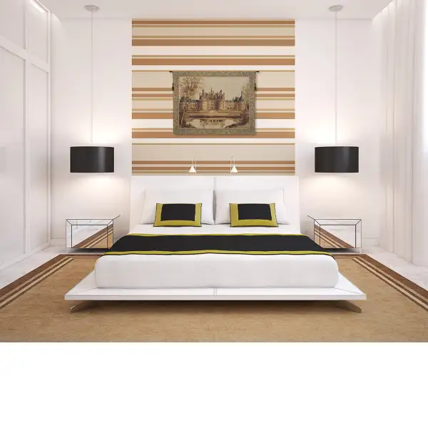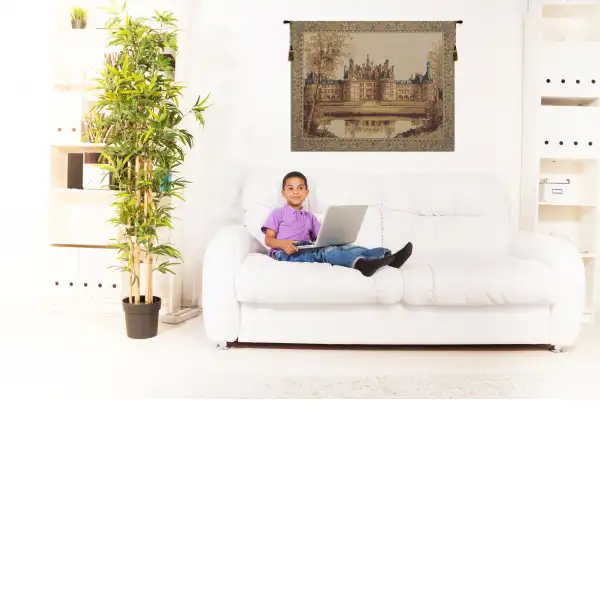 Chambord Castle I is a Belgian made jacquard woven wall tapestry. It displays the royal Château de Chambord in France. It is one of the most recognizable chateaus in the world because of its distinctive French Renaissance architecture, blending traditional French medieval forms with classical Renaissance structures. It was built for Francois I, King of France in 1510 with 440 rooms and 365 fireplaces.