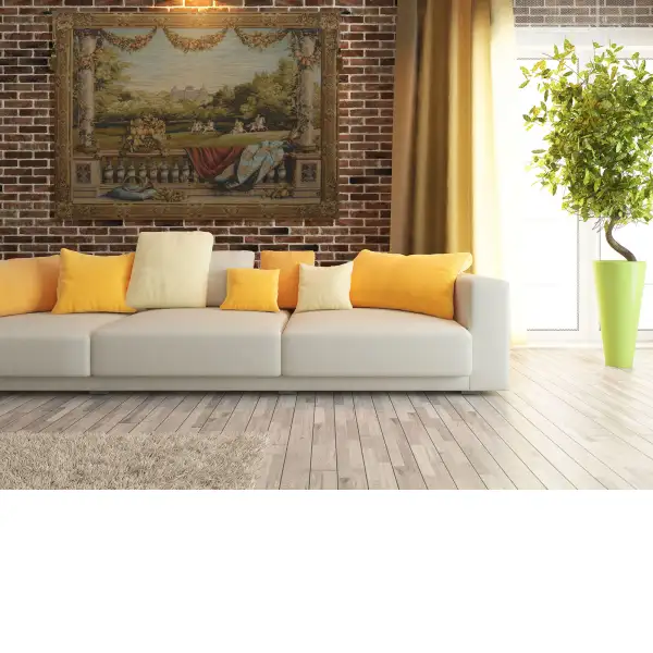 Chateau Bellevue is a flemish wall tapestry inspired from the Tentures des Maisons Royals, set of 12 tapestries. They were woven at the Gobelins towards the end of the 17th century for Louis XIV. Each tapestry depicts a different castle at each month of the year. Here Chateau Bellevue is featured in an August landscape.