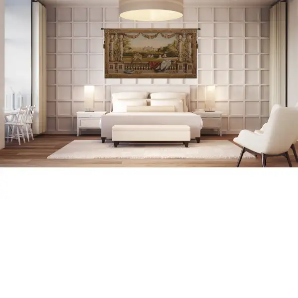 Chateau Bellevue is a French wall tapestry inspired from the Tentures des Maisons Royales, a set of 12 tapestries, one for each month of the year. They were woven at the Gobelins towards the end of the 17th century for Louis XIV. Each tapestry depicts a beautiful chateau during the 12 month cycle. Here Chateau Bellevue is featured in a warm August landscape.