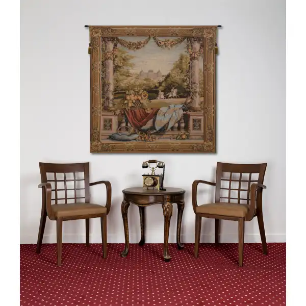 Chateau Bellevue Square Tapestry is but one in a series of twelve tapestries (each reflecting a month of the year) commissioned by King Louis XIV in the late 1600s. Known as the Tapestries of the Royal Households designed by painter to the King Charles le Brun oversaw 250 weavers in producing the tapestry. Our Bellevue Wall Tapestry is inspired by le Brun's 8th tapestry in the series representing August. It is woven expertly in France from luxurious wool and cotton. This wall hanging brings Italian opulence to your home. Backed with lining and tunnel for easy hanging.
