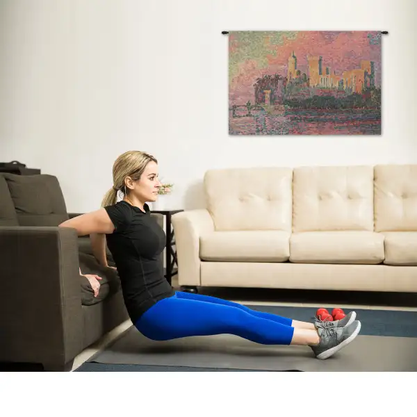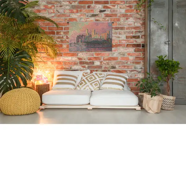Chateau Des Papes is a Belgian jacquard woven wall tapestry. The art comes from a painting by Paul Signac (1863 – 1935) called The Papal Palace, Avignon completed in 1900. Signac was a French Neo-Impressionist painter who, working with Georges Seurat, helped develop the Pointillist style. This painting is Signac's take on The historical palace in Avignon, southern France, one of the largest and most important medieval Gothic buildings in Europe, the Palais des Papes.