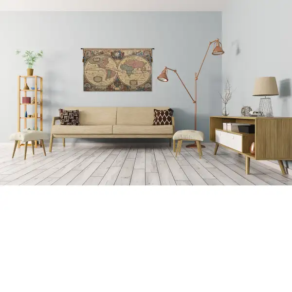 Classic navigational globes were once a mariner’s constant companion, today they’re used for wall décor. Our Chenille Globe Tapestry provides an elaborate display of color and woven beauty. The intricate woven detailing of the world’s countries with a collection of noblemen’s portraiture adorning each corner. Unlike framed paper prints, this woven wall tapestry brings warmth to any room. It makes a handsome addition to a men’s bedroom or formal study. The tapestry is woven in viscose and cotton for luxurious color and texture. Backed with lining and tunnel for easy hanging. Woven in Italy.