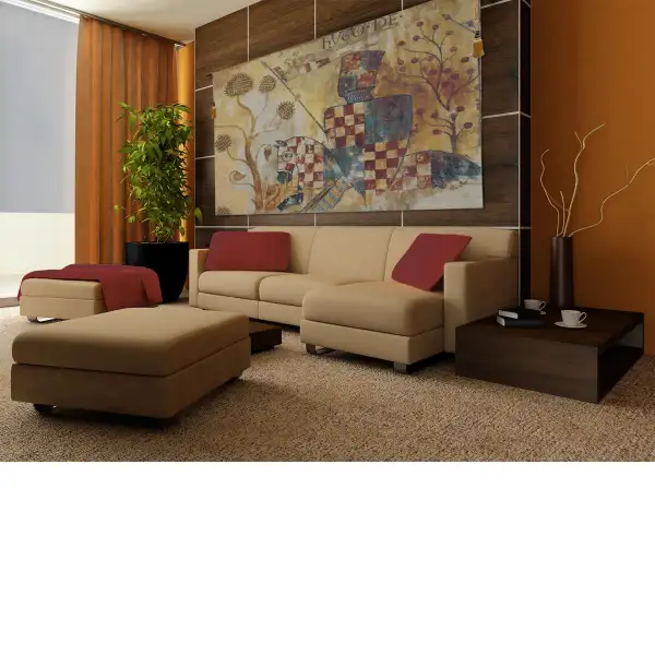 Chevaliers is a Belgian wall tapestry. This piece comes from a 13th century fresco from the church of St. Jacques-des-Guérets representing the departure of the Knights Templar to the second crusade (1146-1148). Here Thibaut de Montmorency caries the crest of the Bouchard family.