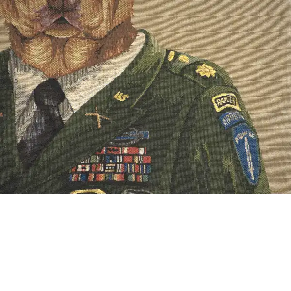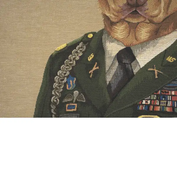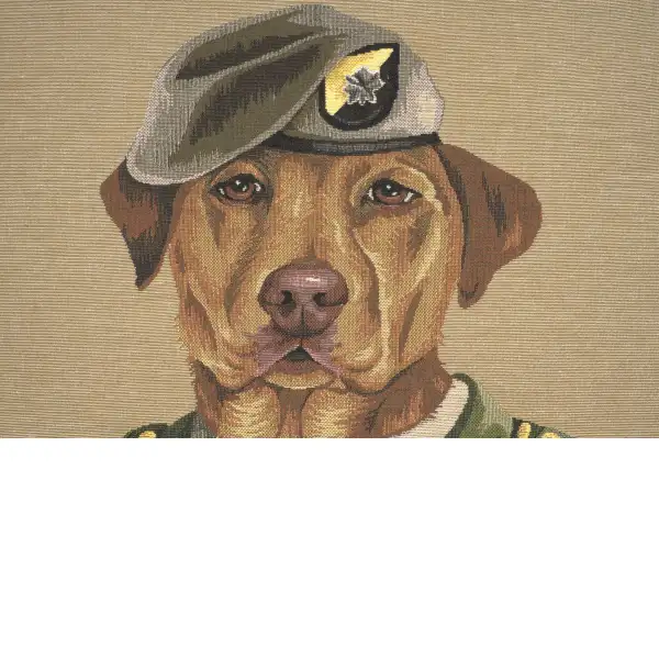 Step into a realm where art meets royalty, and meet the captivating Chien Militaire—a majestic dog adorned in military regalia. This exquisite creation by Thierry Poncelet combines elegance and history, with the dog's attire boasting an impressive array of medals and insignias against a subtle beige backdrop. With soft, serious eyes and a military beret, the brown-hued figure exudes noble charm. More than a mere artwork, this piece serves a dual purpose, doubling as a luxurious cushion cover. Crafted from jacquard-woven tapestry and lined with Belgian velvet, it seamlessly merges aesthetics with functionality, elevating any space it graces. Chien Militaire stands as a testament to Poncelet's ingenuity, breathing life into the canvas and offering a touch of sophistication to discerning admirers.