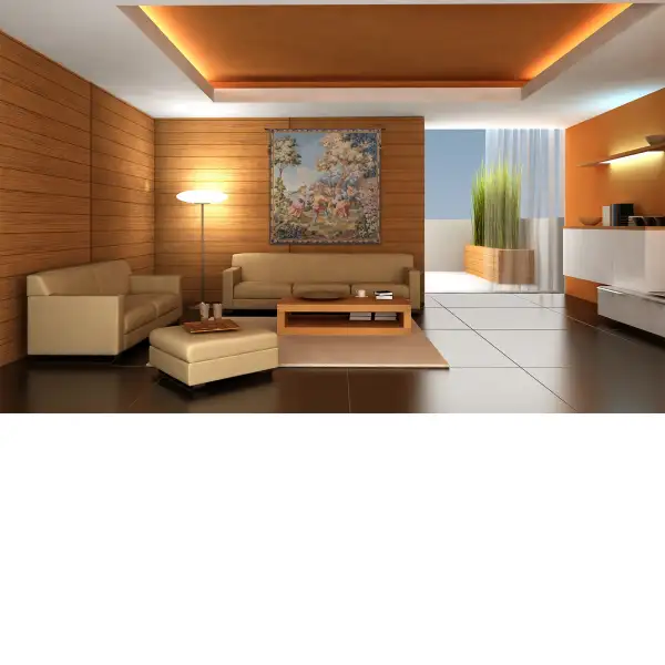 This Belgian wall tapestry, Children, is made in Belgium. It is a reproduction of a nineteenth century tapestry from the collection at Chateau dEnghien. It shows us a joyful scene of children playing in a garden.