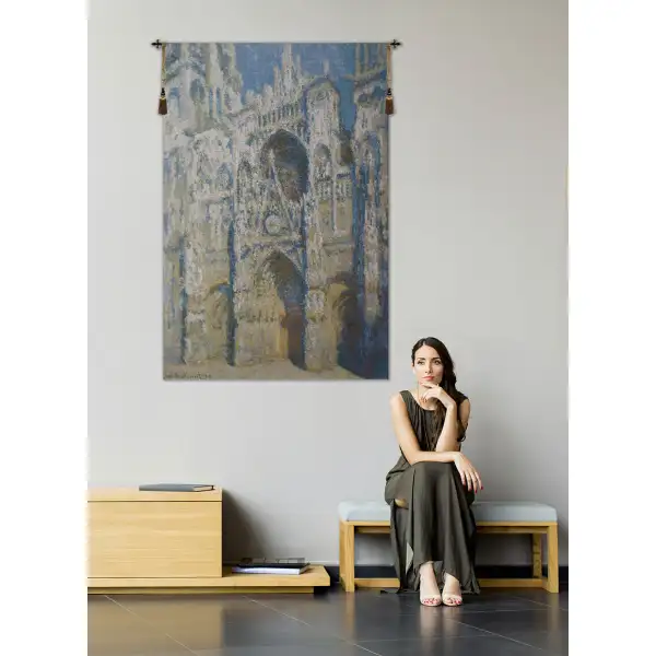Claude Monet is a Belgian made jacquard wall tapestry. It is a reproduction of one of the Cathedral of Rouen paintings done by the master artist. Claude Monet painted a series of paintings of the Rouen Cathedral. The paintings mostly have one viewpoint but are however painted at different times of the day and at different weather circumstances. Here we see the early morning version.