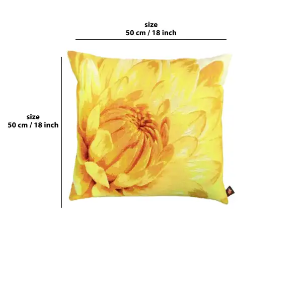 This European jacquard loom woven cushion cover features a close up of a vibrant yellow dahlia. This piece will add a splash of joyous colour to your interior design motif.