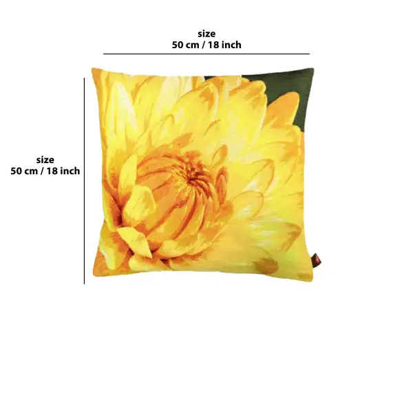 This European jacquard loom woven cushion cover features a close up of a vibrant yellow dahlia. This piece will add a splash of joyous colour to your interior design motif.