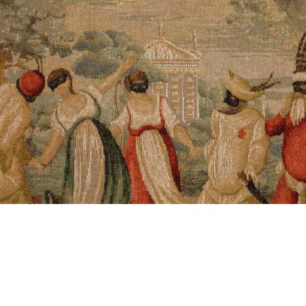 The tapestry "Comedy of Art" vividly portrays the Italian theatrical tradition known as Commedia dell'arte, a form of theater that flourished in Europe from the 16th to the 18th century. This tapestry depicts seven masked actors performing on stage, set against a backdrop of trees and a distant white building, creating a charming pastoral scene. A rich red curtain frames the performance, adding dramatic flair, while a decorative border encases the entire image. The words "Commedia dell'arte" are displayed at the bottom center, honoring this timeless art form. Produced using the Jacquard weaving technique in France, the tapestry showcases the intricate craftsmanship and detail of this method. The Jacquard technique allows for precise control over the loom, translating the lively colors and textures of the original scene into woven fabric. "Comedy of Art" is more than a decorative piece; it celebrates the enduring legacy of Commedia dell'arte, capturing the essence of Italian theater and its rich cultural heritage through the medium of tapestry.