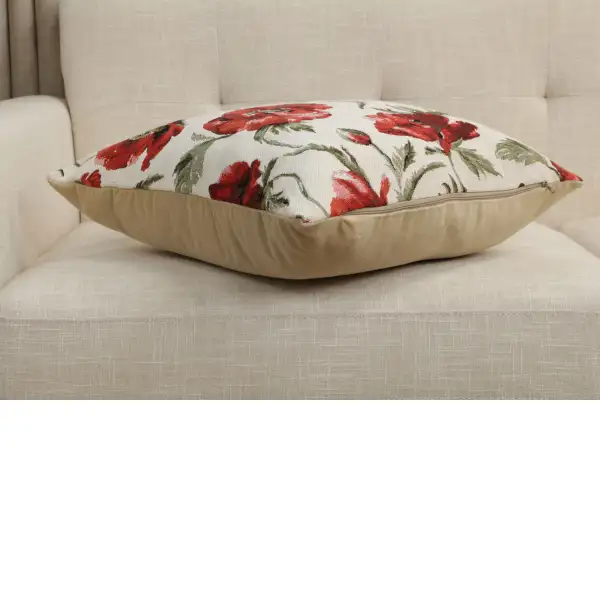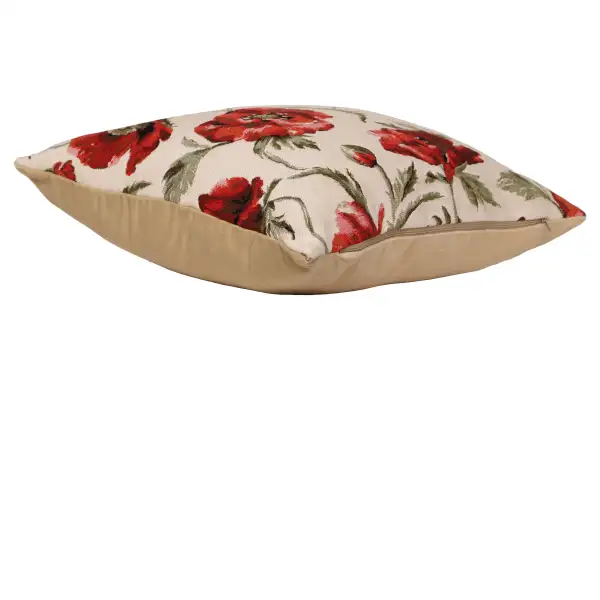 Adorn your living space with this tapestry cushion cover, featuring vibrant red poppy flowers, also known as coquelicots. The bold poppies and lush green leaves are beautifully contrasted against a soft cream background, adding a pop of color to any room. Expertly jacquard woven and made in Belgium, this cushion cover showcases fine craftsmanship. The back is crafted from luxurious Belgian velvet, enhancing the aesthetic appeal while ensuring durability and comfort. Perfect as a toss pillow for your sofa, bed, or favorite chair, this colorful pillow brings a fresh and lively ambiance to any setting.