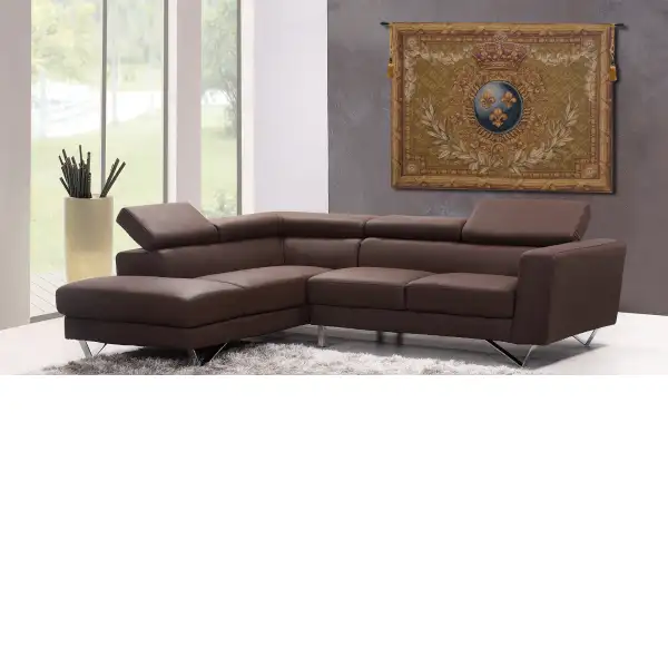 Couronne Empire Tapestry brings a touch of royal décor to the home or office. This intricately woven jacquard wall hanging mirrors the coat of arms used by royal French families for many centuries. The trio of fleur de lis woven in the blue field represent the lily flower with a jeweled crown reigning over from above, reflective of the ancient French coat of arms and later the English kings to show their claim to France’s throne. Regal gold, blue and rose woven in the most ornate patterns with decorative border lead the design of this beautiful tapestry. Hang in the formal living room, dining room or entry. Made from soft cotton/wool blend for a natural appearance and feel. Woven in France with lined back and tunnel top for easy hanging.
