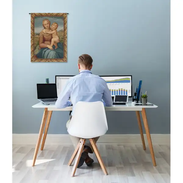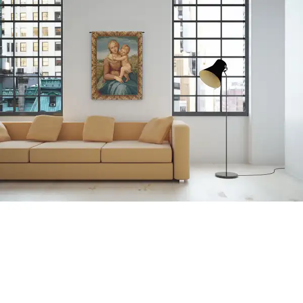 Cowper Madonna by Raphael is an Italian jacquard wall tapestry. The image comes from a painting by the Italian High Renaissance artist Raphael, depicting Mary and Child, in a typical Italian countryside. It has been dated to around 1505