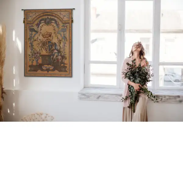 Dame Au Blason is a jacquard wall art tapestry from a late 17th century design made for the wedding of Elizabeth Charlotte de Orleans, niece of Louis XIVth. It shows a woman and two children holding up a crown topped shield surrounded by flower garlands on a yellow background.