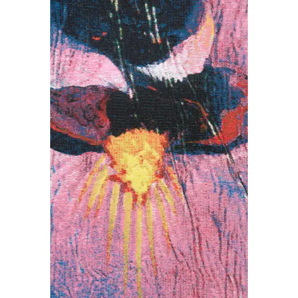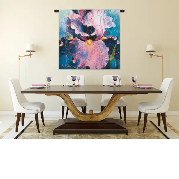 Dancer - Simon Bull is a Belgian made jacquard wall tapestry. It features an Iris flower in vivid and evocative pinks and blues, streaked by other colors to create a scene where we are unsure if we are observing reality or a dream. The intense pink and blue suggests a dreamlike state that pulls in the viewer, a trademark of the work of British-born Simon Bull.