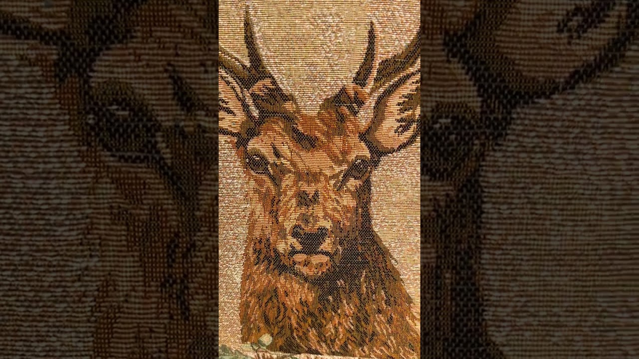 Hunting lovers will appreciate this artisan crafted European jacquard tapestry cushion cover Deer - Doe & Stag. A fawn and Doe appear in the left corner above a stag's silhouette. The right side is a detailed front view of a stately stag. The background is in two shades of brown.