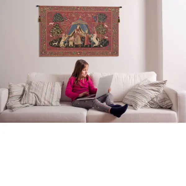 Desire A Mon Seul Desir is a Belgian made jacquard woven wall tapestry. The original design is from the fifth century tapestry of the Medieval Lady and the Unicorn Series of the Five Senses. A Mon Seul Desir translates to "my sole, or only desire", and is understood to represent love. Likely from the school of Bruges for Jean Le Viste. The original tapestry is displayed at the Cluny Museum in Paris.