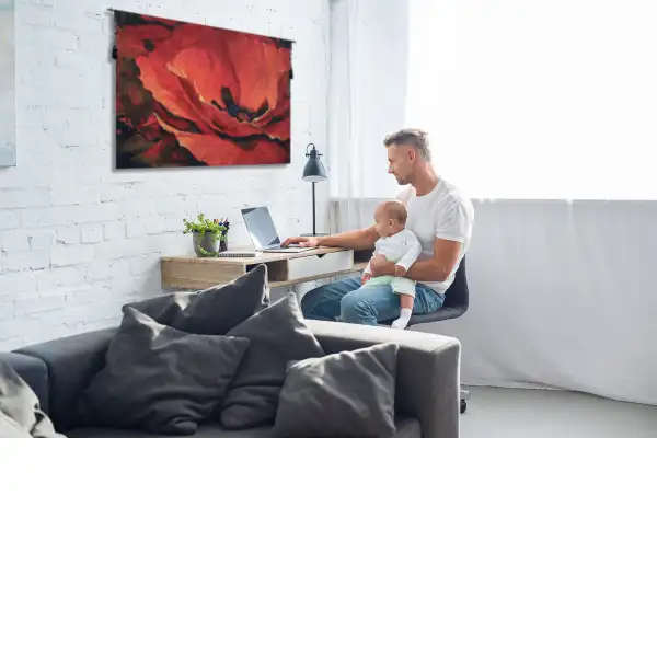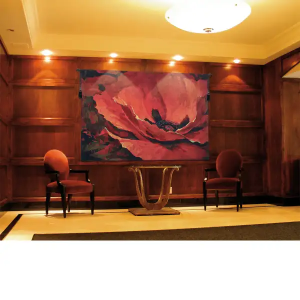 Desiree - Simon Bull is a jacquard wall tapestry made in Belgium rendering the artwork of Simon Bull. Here we see a fiery red flower with a richly intense center stamen of blue. The masterful shading work makes the intricacies of the petals into a world in of itself. Bringing the viewer a sense of being a miniature creature walking through the magical world of flowers.